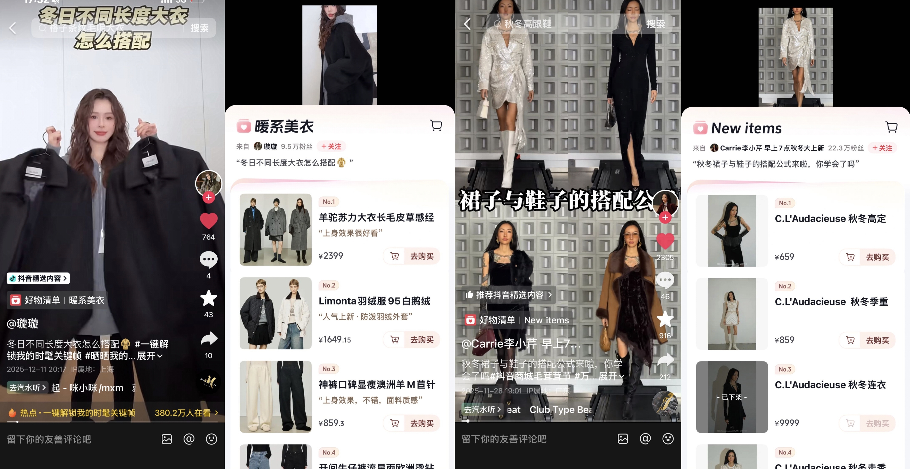 @璇璇 以穿搭实用美学为内容主线,在解决“大衣长度搭配”痛点的视频中,借助「好物清单」将大衣、内搭及配饰组合成“冬日大衣搭配”整体解决方案清单,有效提升客单价。而 @Carrie李小芹,在“秋冬裙子与鞋子的搭配”视频中,以清晰易懂的“公式”,将常见穿搭痛点转化为直观可学的穿搭模板,并通过「好物清单」将模板一键转化为可购齐的完整搭配,引流直播间成交近3万元,验证了“风格公式+清单转化”模式的实效性。